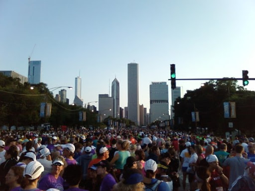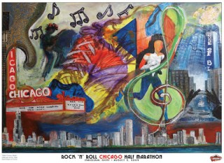 This blog’s title came from my experience meeting Nell at the 2009 Chicago Rock-n-Roll half marathon. Her art became the official artwork of the race and is what’s at the top right of this blog. I bought that poster and she signed it for me. She’s an elite runner who took time to talk to me and give me advice on how to get faster. She signed it “Try to Fly….” The image at the top left is that poster. The image at the top right is at race start in downtown Chicago.